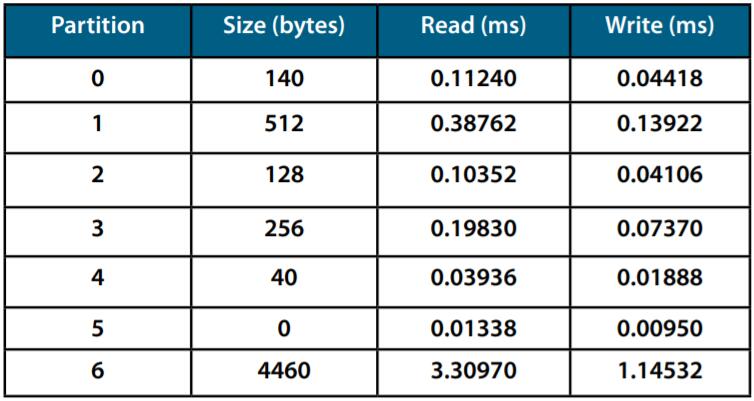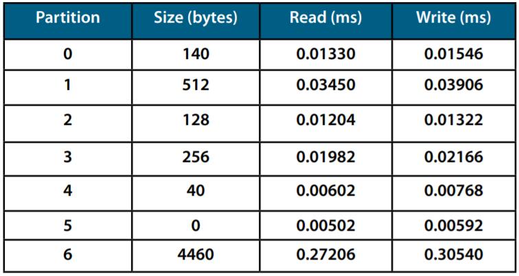 MRAM低級(jí)驅(qū)動(dòng)程序通過操作系統(tǒng)和調(diào)度程序集成到動(dòng)力總成應(yīng)用程序中。讀寫周期由系統(tǒng)時(shí)鐘(300MHz)測量。圖1&2顯示了針對動(dòng)力總成應(yīng)用的具有不同非易失性存儲(chǔ)器接口的每個(gè)分區(qū)的讀/寫時(shí)間。這些表顯示大多數(shù)讀/寫周期小于2ms。毫不奇怪,該表確認(rèn)35ns并行接口以比40MHz