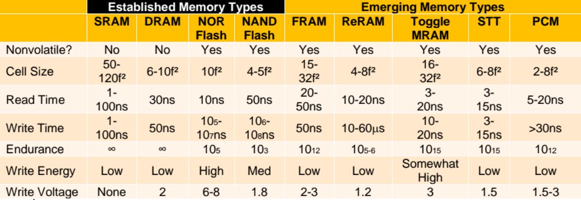 當(dāng)前存儲(chǔ)器和新興非易失性存儲(chǔ)器技術(shù)的特點(diǎn)