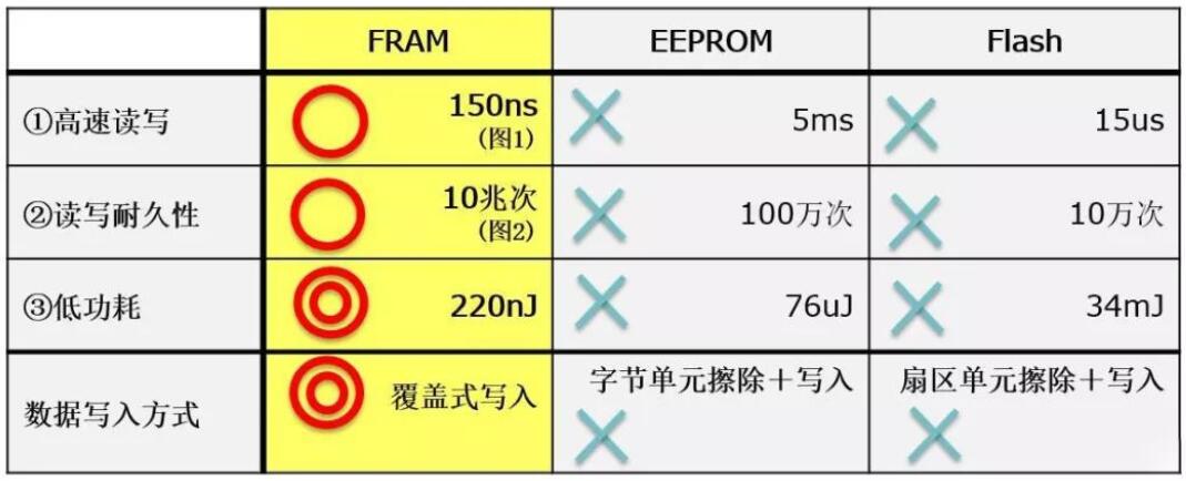富士通FRAM主要具備三大優(yōu)勢:高讀寫入耐久性、高速寫入以及低功耗,這是絕大多數(shù)同類型存儲器無法比擬的。比如FRAM寫入次數(shù)壽命高達10萬億次,而EEPROM僅有百萬次(10^6)。