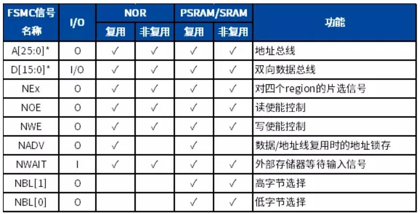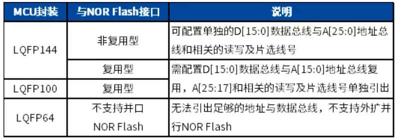 Nor Flash,可以選用復(fù)用或非復(fù)用方式擴(kuò)展NOR Flash,還可以通過配置實現(xiàn)外擴(kuò)8位總線或16位總線接口的NOR Flash。