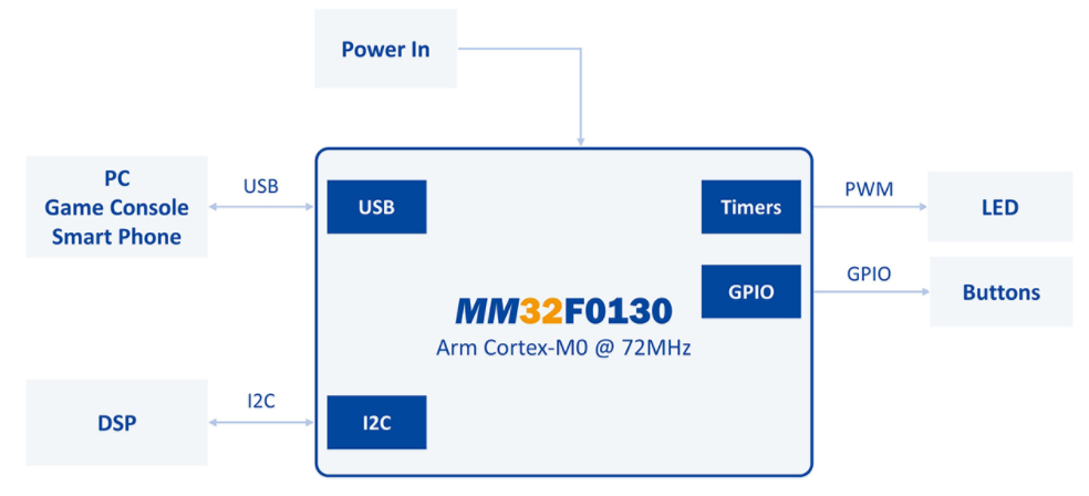 靈動微MM32F0133C7P整合USB接口與豐富的資源,在設(shè)計(jì)外接聲卡時能與DSP做連接與溝通,此外USB界面通過USB-IF certificate,無論是在接到Host端的PC/NB,Game console與Smart Phone都可以有良好的兼容性。