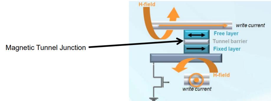 MRAM或磁性隨機存取存儲器使用1晶體管–1磁性隧道結(1T-1MTJ)架構,其中鐵磁材料的磁性“狀態”作為數據存儲元素。由于MRAM使用磁性狀態進行存儲(而不是隨時間推移而“泄漏”的電荷),因此