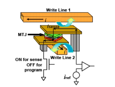 實(shí)現(xiàn)MRAM可靠存儲(chǔ)的一個(gè)主要障礙是高位干擾率。對(duì)目標(biāo)位進(jìn)行編程時(shí),非目標(biāo)位中的自由層會(huì)被誤編程。目前飛思卡爾半導(dǎo)體研究人員已經(jīng)成功解決了此問(wèn)題,其方法是,在每次出現(xiàn)位狀態(tài)空翻時(shí),產(chǎn)生一個(gè)跳變位,它將磁矩的方向旋轉(zhuǎn)到同一方向。寫(xiě)入線1和寫(xiě)入線2上的反轉(zhuǎn)脈沖電流使極性旋轉(zhuǎn),從而不會(huì)干擾相同行或列的其它位元。