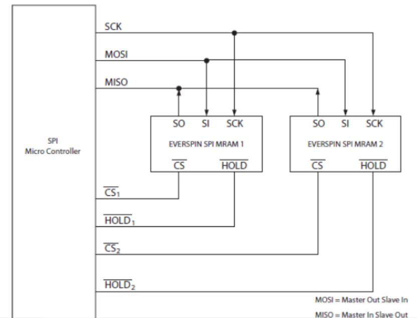 單個(gè)或多個(gè)器件可以連接到SPI總線,如下所示。引腳SCK,SO和SI是常見的設(shè)備。每個(gè)器件都需要分別驅(qū)動(dòng)CS和HOLD引腳。